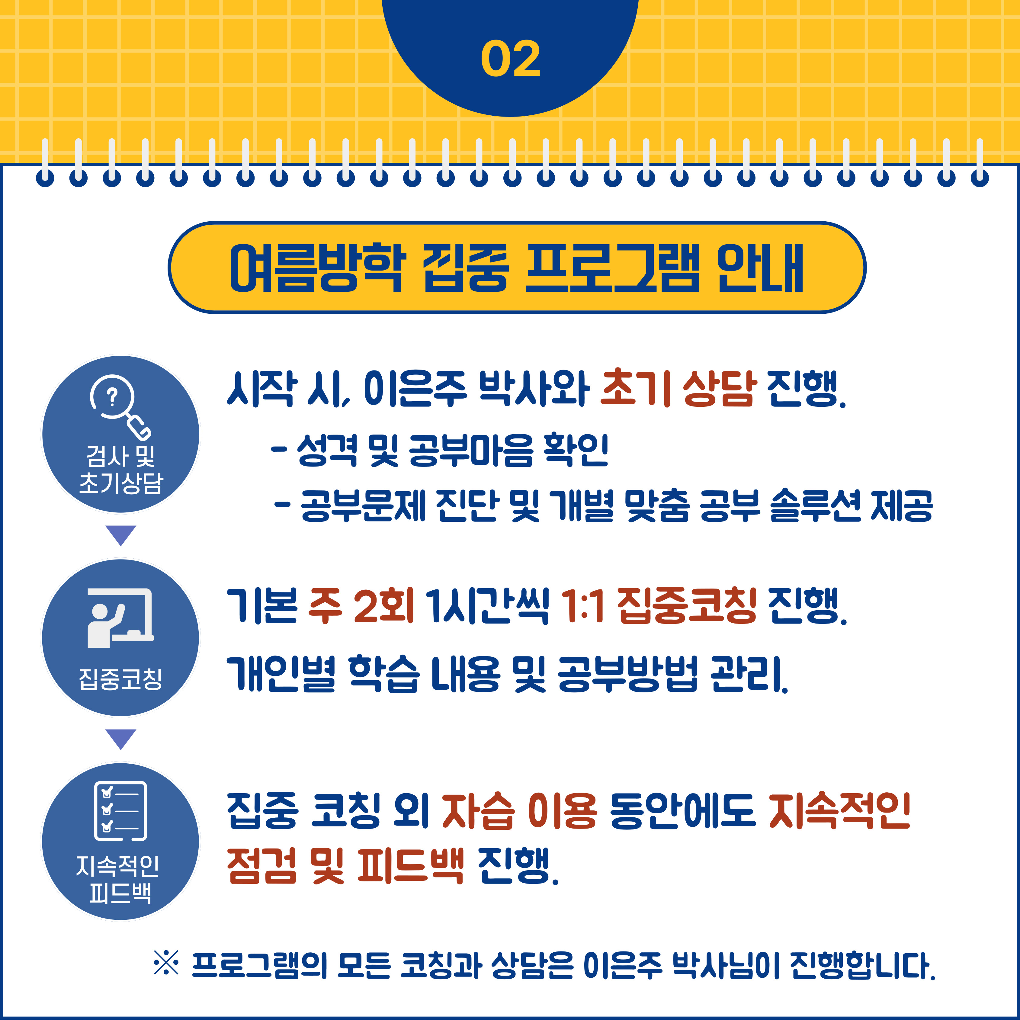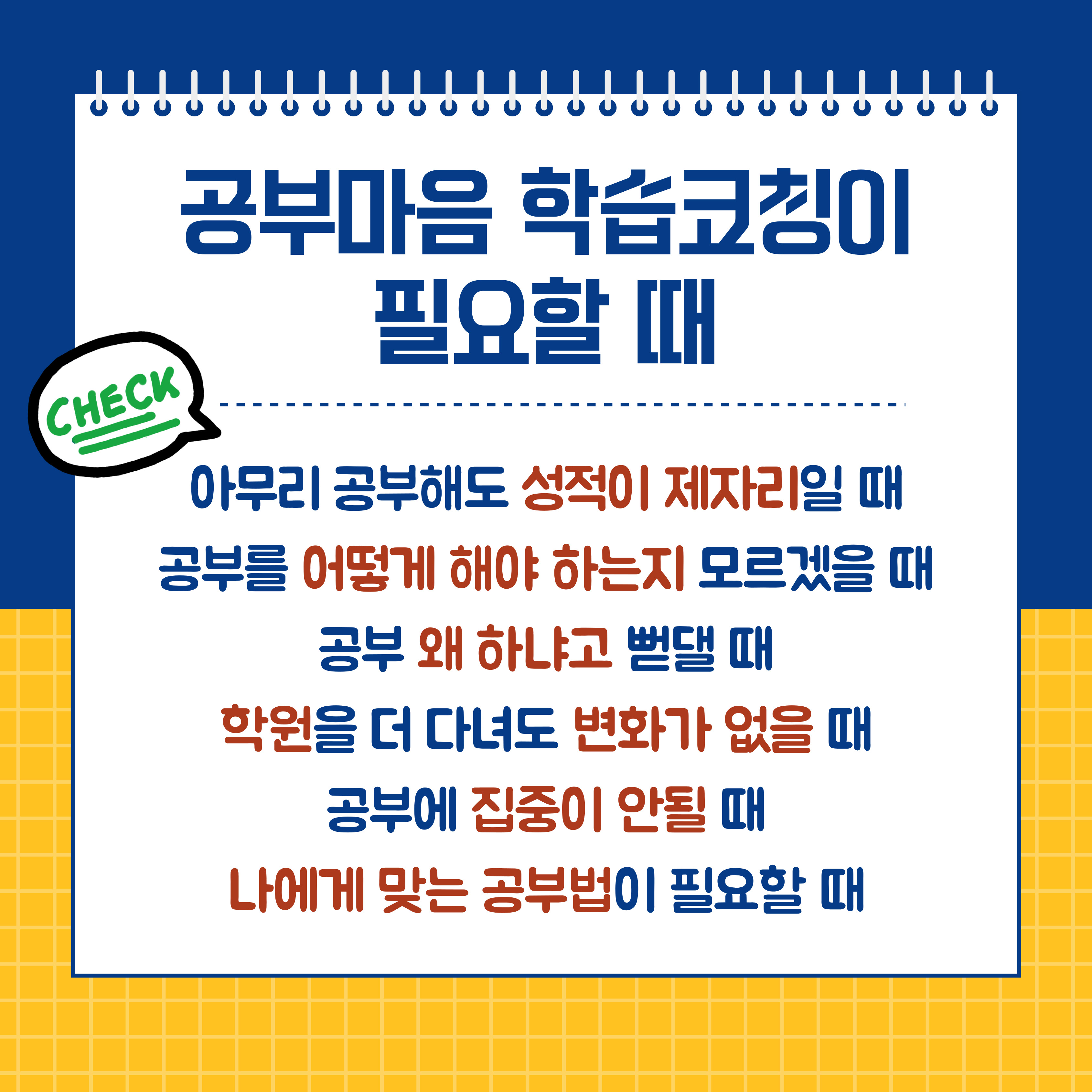 <공부마음 학습코칭>은 공부마음과 성격에서 공부문제와 해법을 찾고, 그 문제를 극복할 수 있는 심리적 코칭과 개인 맞춤 공부방법 코칭을 병행하여 효율을 극대화합니다.
